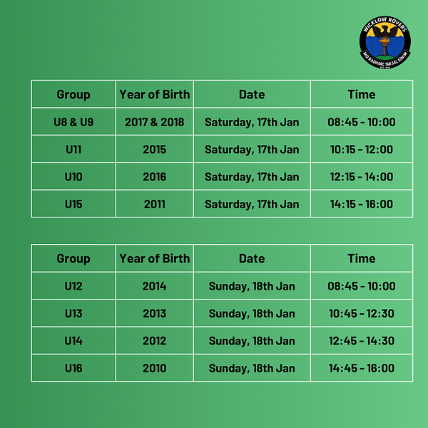 - U8 & U9 (Born 2017 & 2018): 08:45 â 10:00