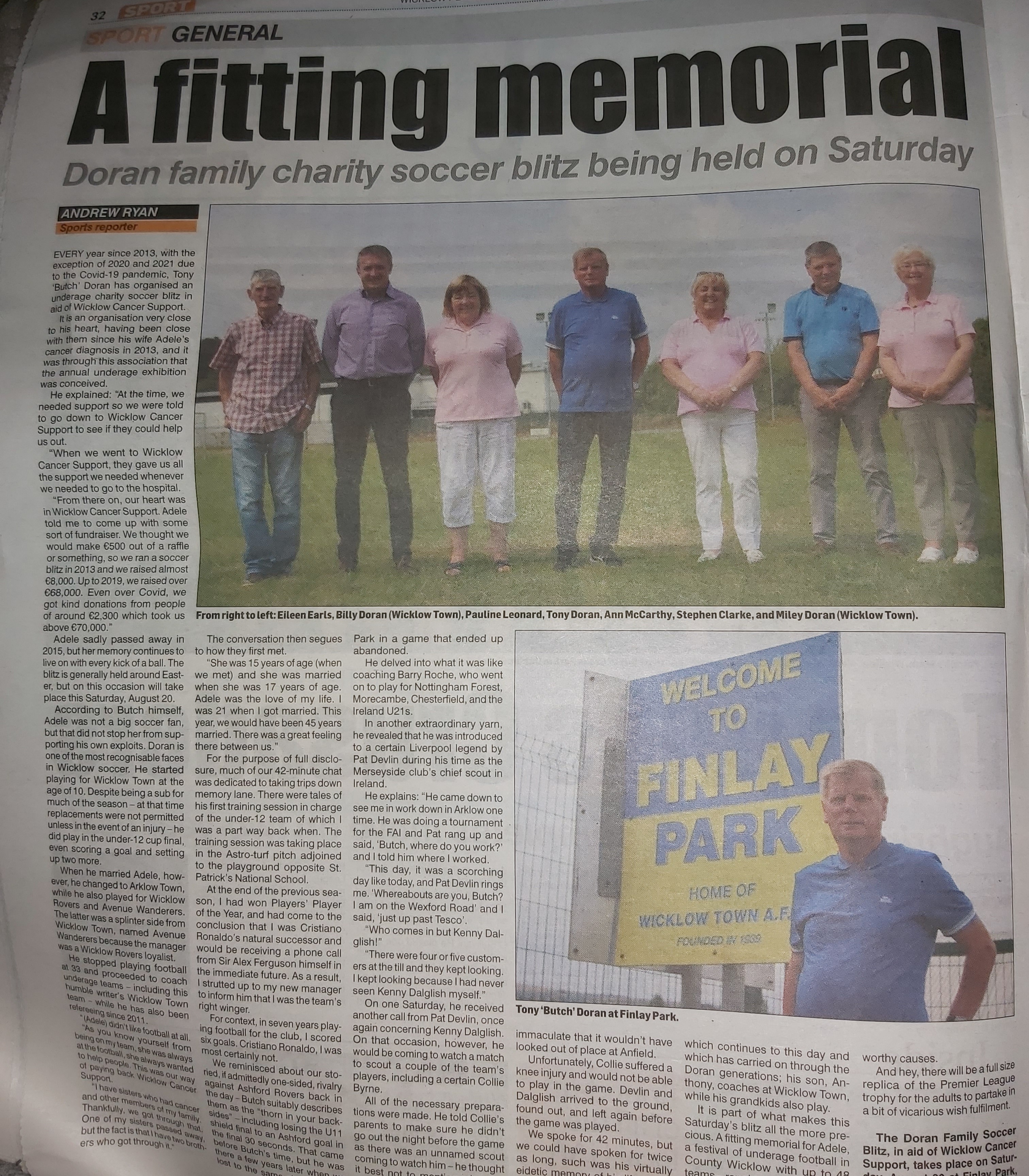 The Doran Family Football Blitz takes place this coming Saturday with games taking place on our pitch at Whitegates and on our neighbours Wicklow Town's pitch at Finlay Park. The games will run for most of the day with the club entering 7 teams in the event. All proceeds from the event is in aid of Wicklow Cancer Support. This event is for a worthy cause and is spear headed by Tony Butch Doran and the Doran family and his trusted helpers. Its an event the club are proud and delighted to assist with every year. If you find yourself with a bit of spare time on Saturday why not come along and lend some support for the teams and organisers. Well done to the Doran Family again and everyone that helps make this day a success. The best of luck with everything on Saturday.